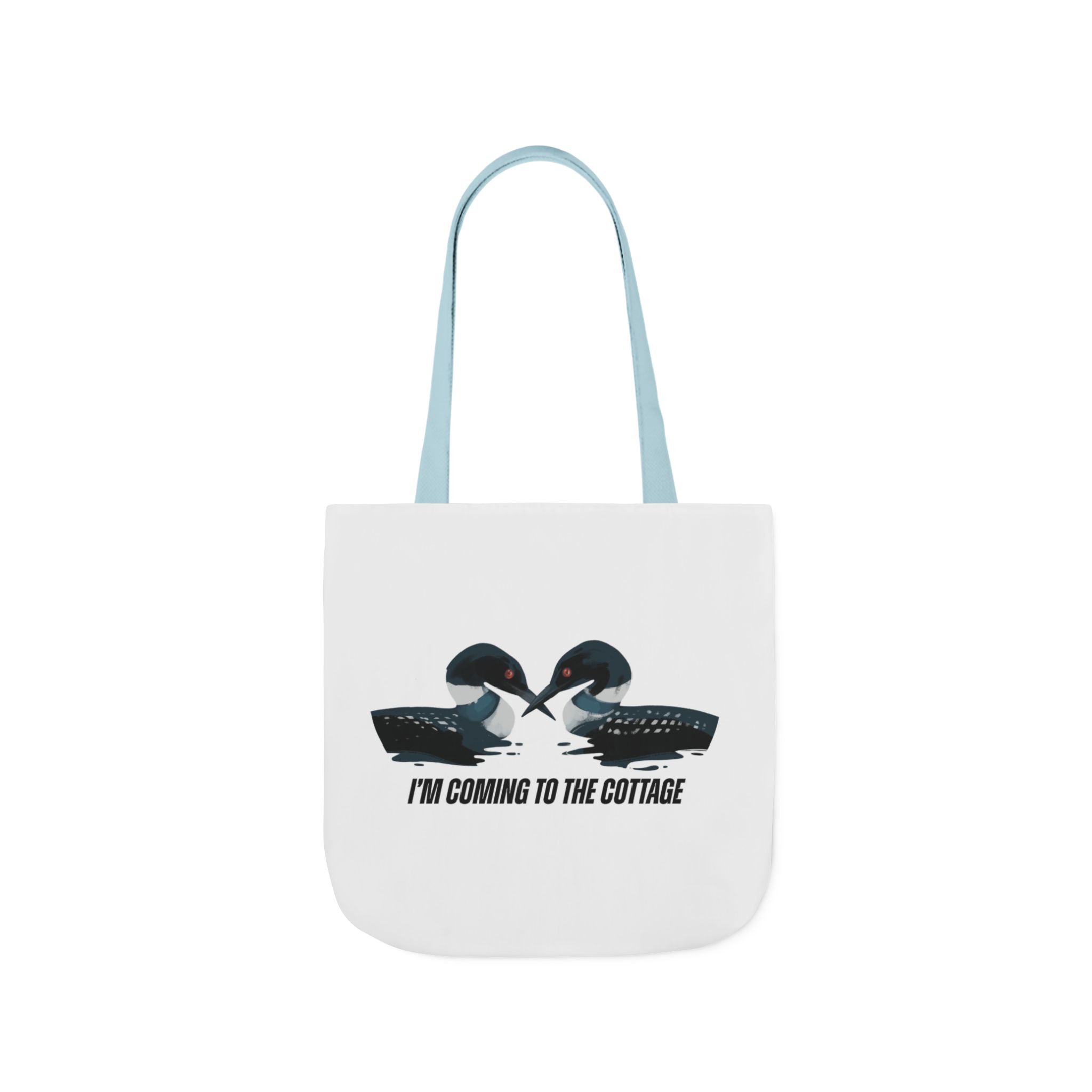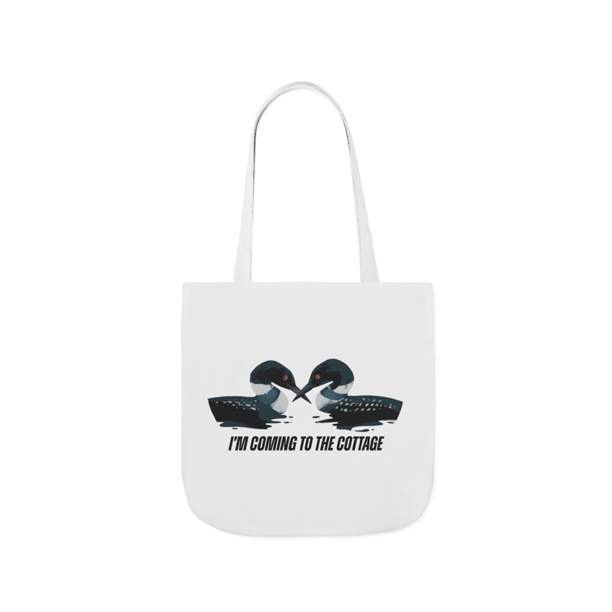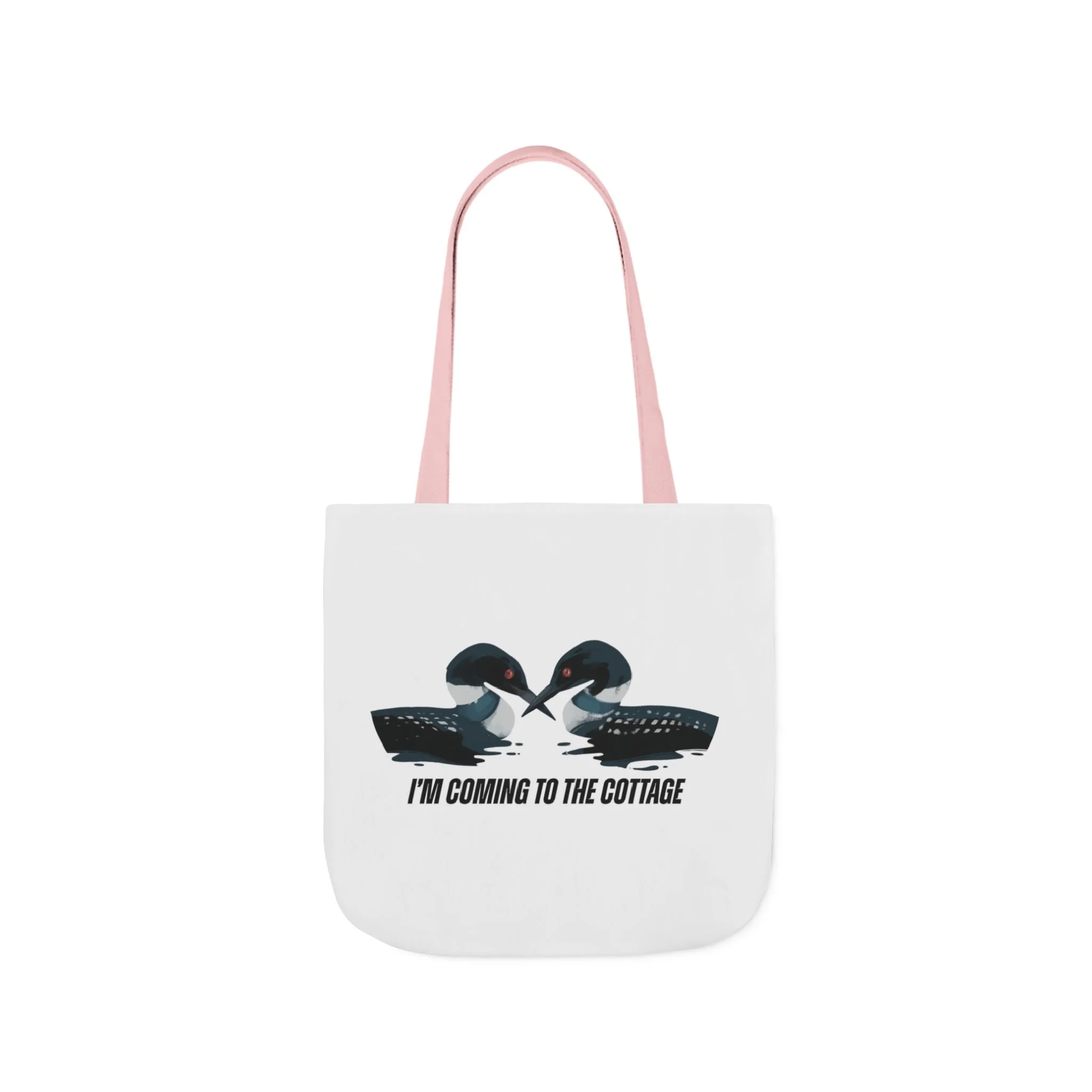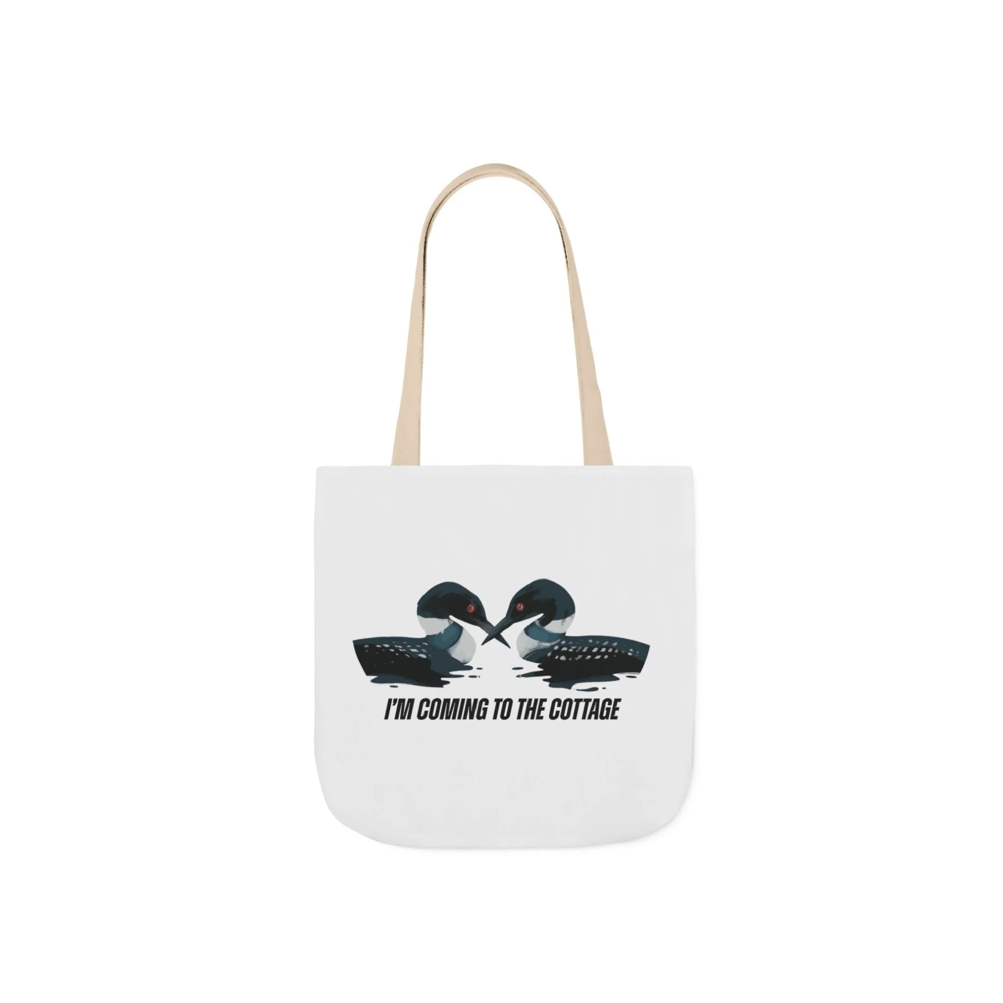 Rep your favorite wolfbird boys' with this durable canvas tote that reads "I'm coming to the cottage."