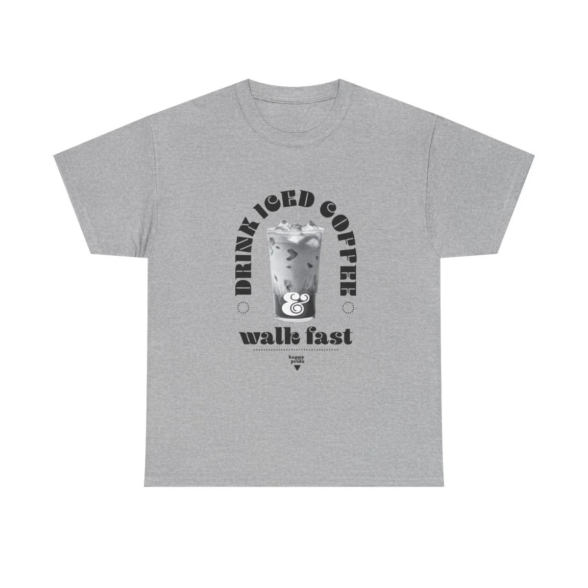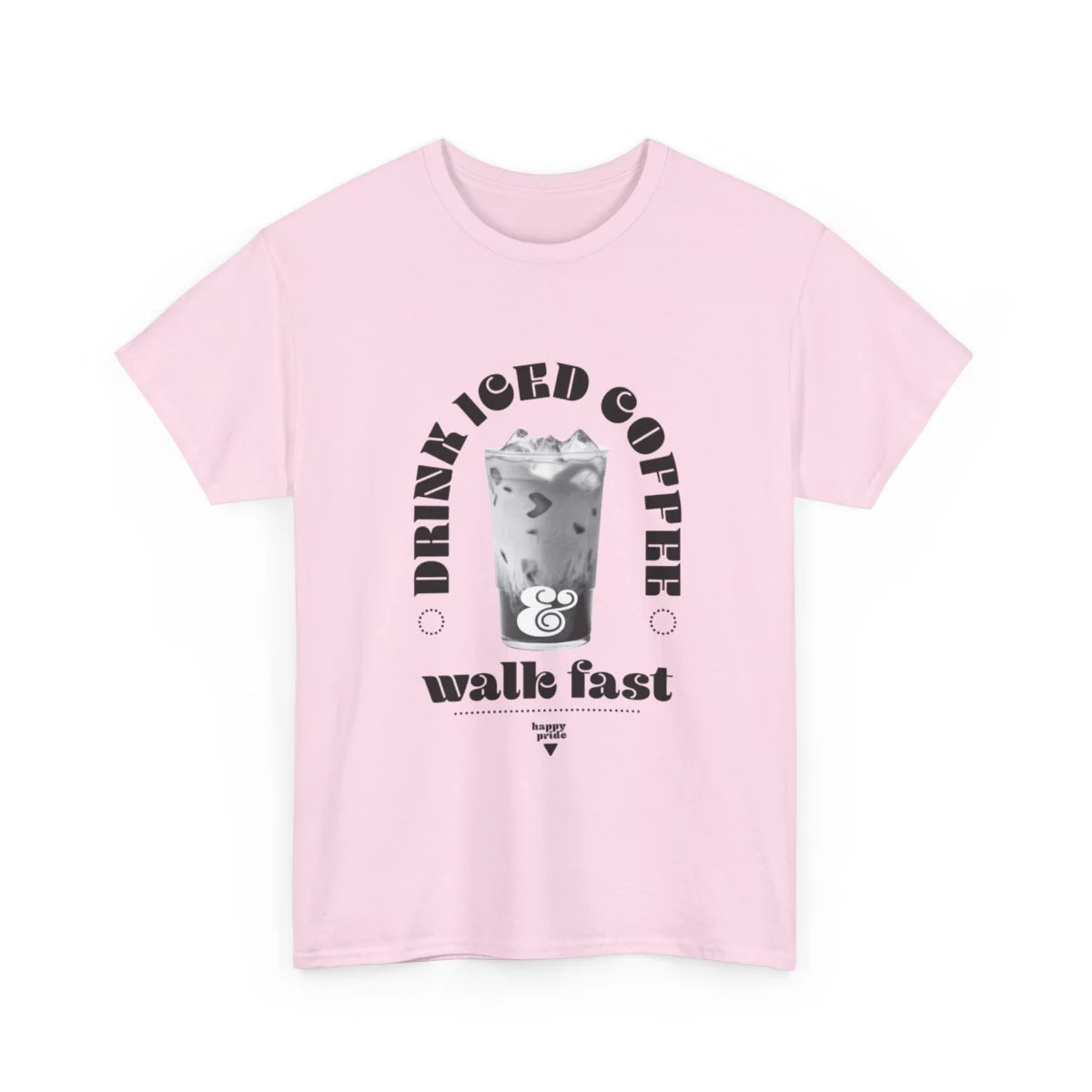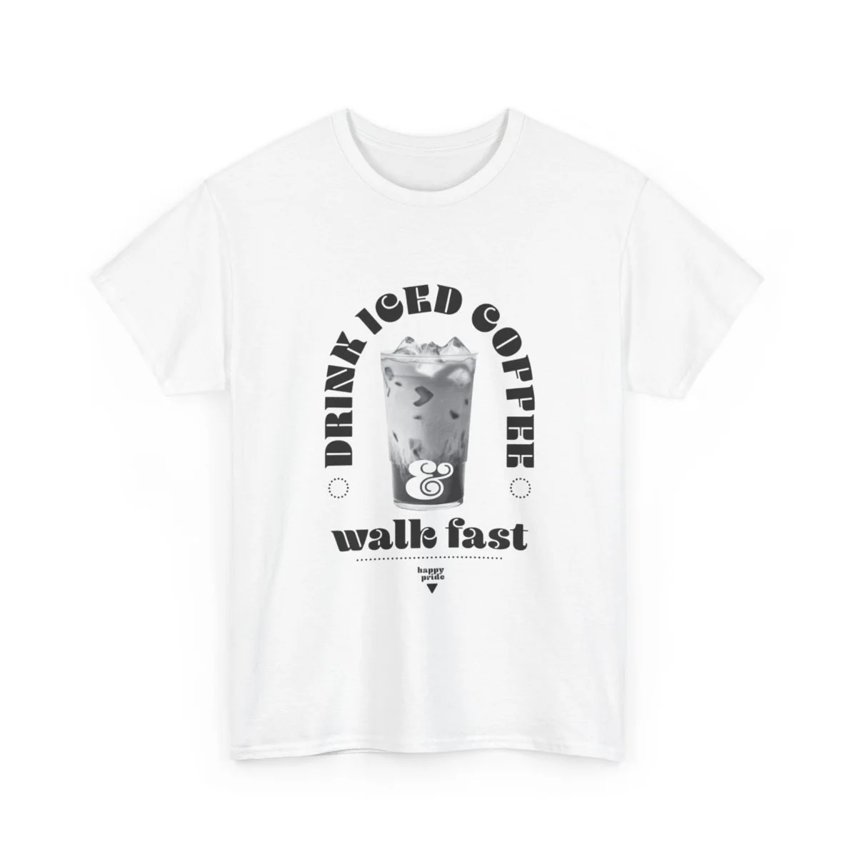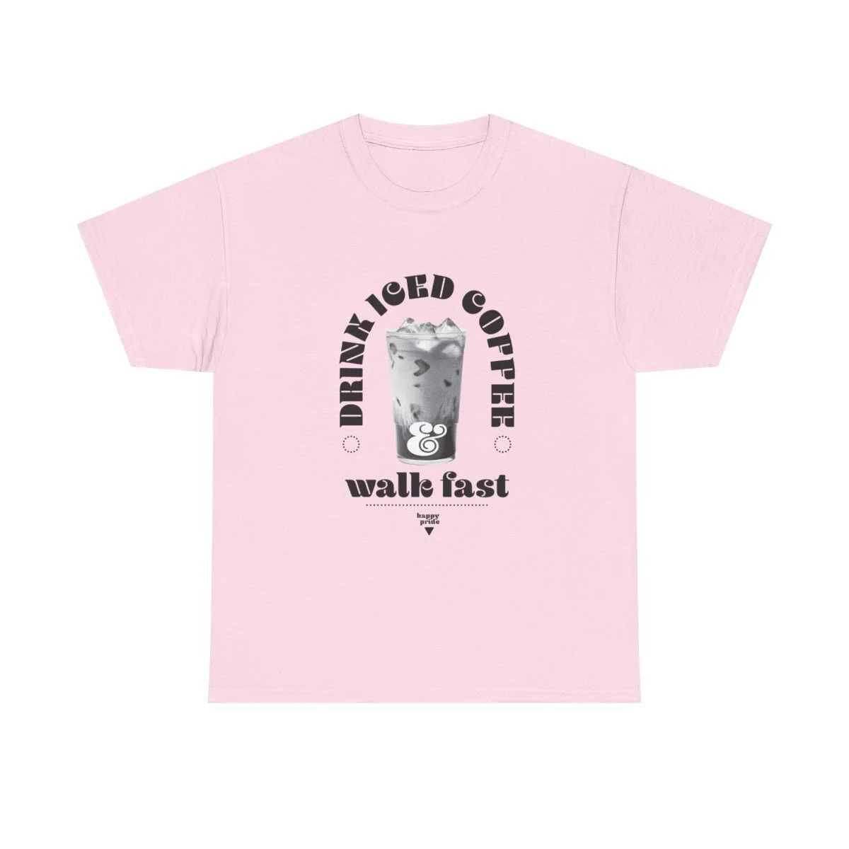 Show your pride all season long with this unisex heavy cotton tee with the emblem of pride, words, "Drink iced coffee and walk fast," with small sub title "HAPPY PRIDE" in grit text. This one is for you, bestie.