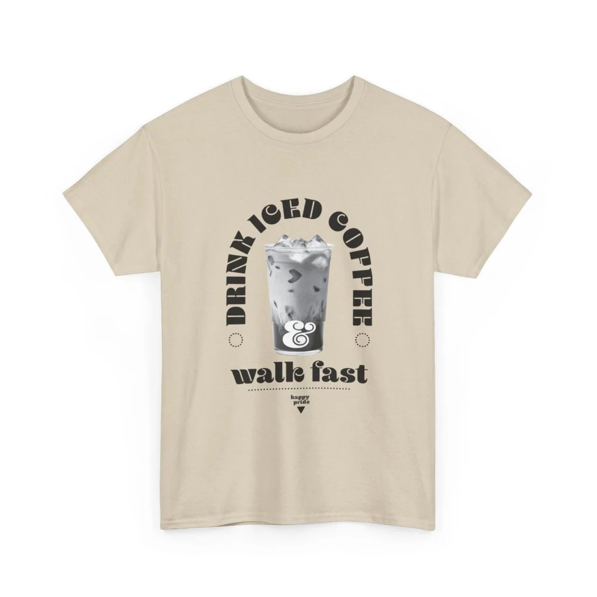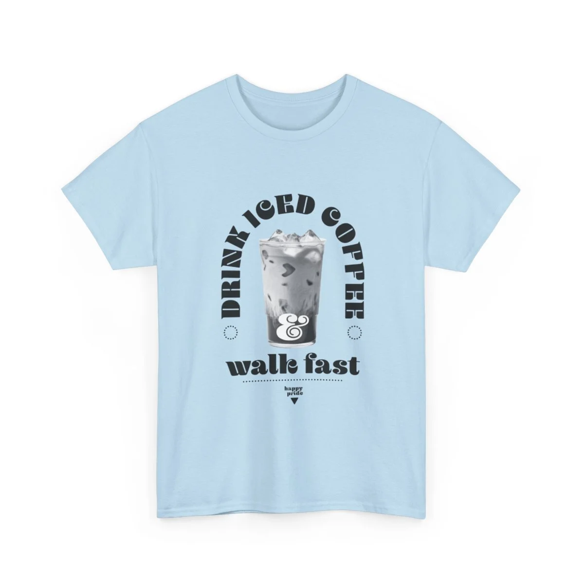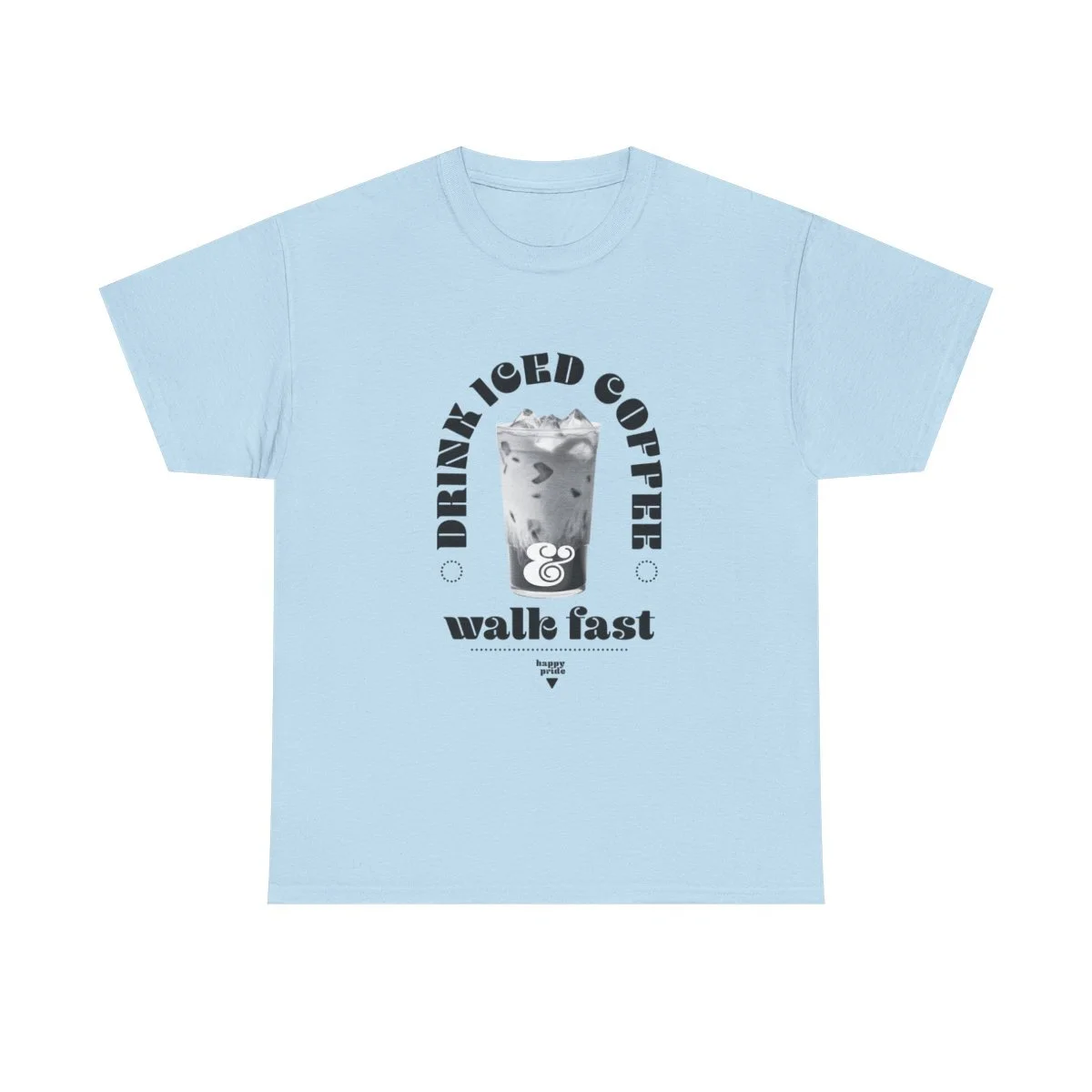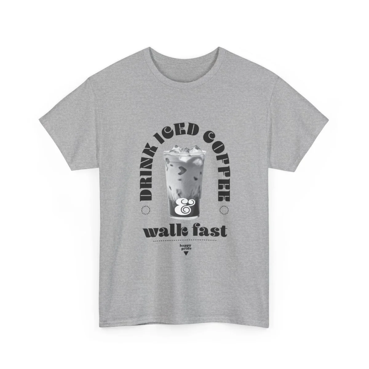 Show your pride all season long with this unisex heavy cotton tee with the emblem of pride, words, "Drink iced coffee and walk fast," with small sub title "HAPPY PRIDE" in grit text. This one is for you, bestie.
